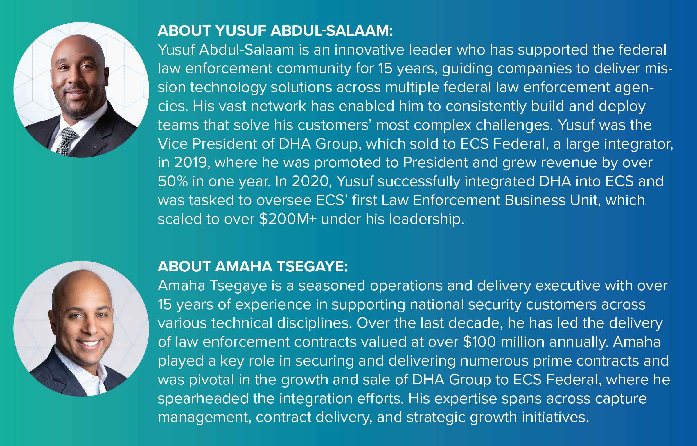 Building on its established reputation for investing in technology-enabled services within the federal market, NewSpring Holdings is now expanding its reach by developing a new platform to support federal law enforcement. To lead this initiative, NewSpring Holdings is collaborating with Yusuf Abdul-Salaam and Amaha Tsegaye, two prominent federal leaders who possess extensive knowledge, experience, and relationships with federal law enforcement customers and the technology community. With their executive leadership experience in technical solutions, mission prowess, and having been part of multiple M&A transactions, Yusuf and Amaha offer a unique perspective on the specific needs of federal law enforcement agencies and the existing gaps in the market.