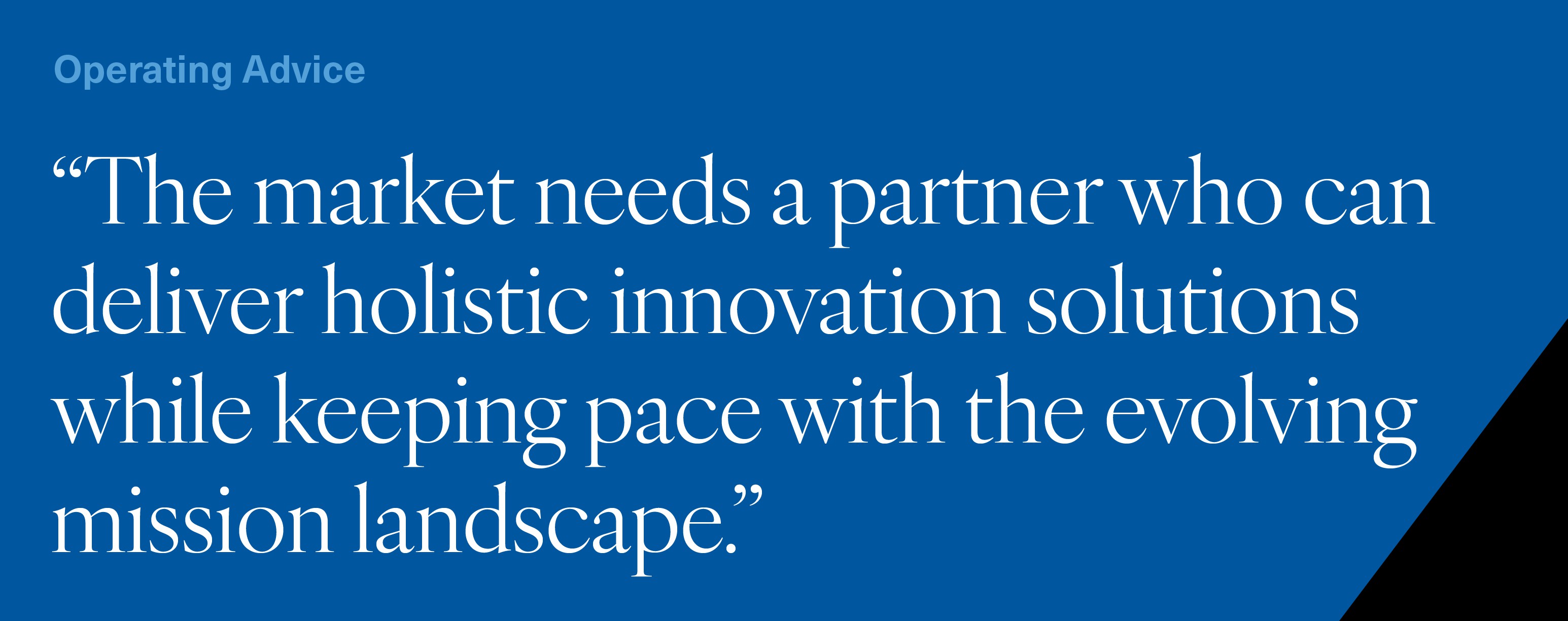The mission landscape is rapidly evolving, necessitating a diverse array of technology to support federal law enforcement agencies. The current vendor community is ill-equipped to address these dynamic requirements because larger companies can lack the agility to react quickly, and smaller vendors can lack the resources to deliver their innovative solutions at scale. The market needs a partner who can deliver holistic innovation solutions while keeping pace with the evolving mission landscape. Mission partners who provide customer-centric approaches by integrating top-tier offerings can deliver a distinctly unique value.